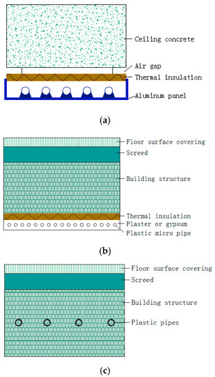 Types of radiant cooling systems. (a) Radiant panel system; (b) embedded surface system and (c) thermally activated building system [6,16].