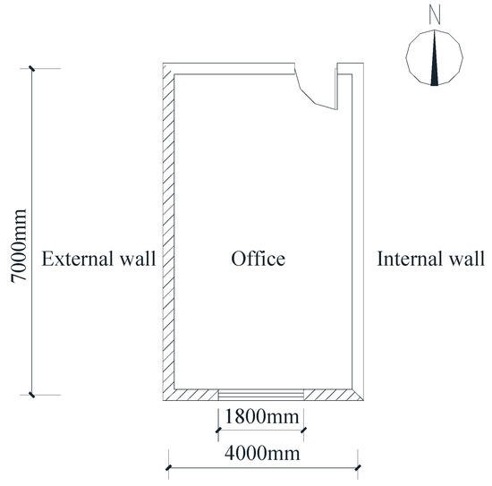 In this study, a typical office block in Xi’an, a typical city representative of a cold zone in China was chosen to be the case study [44]. The studied building has three stories and a shape coefficient smaller than 0.3. All the rooms at the same location on every story were chosen as objects for this research. The floor plan of the room, studied on each floor, is shown in detail in Figure 2. The total area of the room studied is 28 m2 with a height of 4.5 m. Exterior walls are located to its south and west, while interior walls are located east and north. The rooms adjacent to the studied rooms are also air-conditioned. The internal heat gains were considered to include all equipment inside the office, all lighting, as well as people. The rooms are always occupied during working hours, i.e., Monday, Tuesday, Wednesday, Thursday, and Friday, from 8 a.m. to 6 p.m.