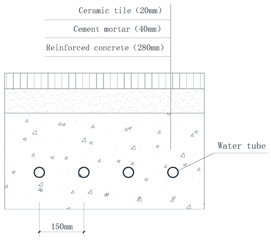 The thermal parameters of building envelopes are shown in Table 1. Concrete floors combined with ceiling radiant cooling were used to increase the cooling surface area. The cooling floor or ceiling is mainly composed of a load-bearing structure layer, a leveling layer, a surface layer, and embedded tubes, and a thermal insulation layer is increased in the cooling floor. The structure of the radiant cooling slab is shown in Figure 3. The cooling capacity of the tube-embedded slab is not only related to thermal parameters of envelopes but also to the geometric parameters of embedded tubes. The relevant geometric and thermophysical parameters of embedded-tubes in the concrete slab are shown in Table 2. One of the main factors influencing the cooling capacity of the cooling slab is the surface temperature of the cooling slab. The lower the cooling surface temperature, the greater the cooling capacity. However, in order to prevent condensation on the cooling surface and ensure the thermal comfort requirements of the human body, the temperature of the cooling surface should not be too low. The Chinese design code ‘Technical Specification for Radiant Heating and Cooling’ (JGJ 142-2012) [45] specifies that the lower limit of the mean temperature of cooling floor surface which people often occupy is 19 °C, and the lower limit of the mean temperature of the cooling ceiling surface is 17 °C. Because cooling the surface temperature depends on the water supply and return temperature, the water supply temperature should not be too low. In the simulation, the water supply temperature was set at 19 °C.