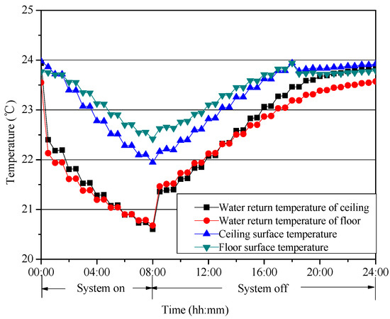 Figure 4 shows the variation trends of the cooling surface temperatures and water return temperatures during a typical day. It can be seen that the cooling surface temperature decreases with the increase of the cooling time but gradually increases after the stop of cooling, due to the presence of indoor heat gains. The surface temperatures of the ceiling and floor vary in the range of 22 to 24 °C on 10 July, which meet the requirements of the Chinese standard ‘Technical Specification for Radiant Heating and Cooling’ (JGJ 142-2012) [44]. It can also be seen from the figure that the water return temperatures vary within a small range when the water supply temperature is constant. Their variation trends are similar to that of the cooling surface temperatures. They gradually decrease with the increase of cooling time and then gradually rise and are close to the cooling surface temperatures at the end. This shows that when the TESCS is intermittently operated, the water return temperature will fluctuate within a small range when the water supply temperature is constant.