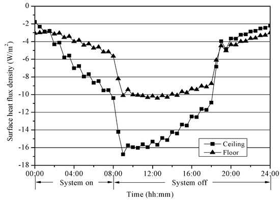 Because concrete has a high thermal mass and a strong ability to store thermal energy, the tube-embedded cooling slab can be regarded as a cold source and also a large cold storage unit. The cooling capacity provided by embedded tubes is stored and transmitted inside the concrete slab. Because there are heat storage and release in the heat transfer process of the concrete radiant slab, the cooling capacity cannot be immediately reflected to the room. The transient cooling capacity of the cooling slab can be described by the indictor of the surface heat flux density, which is a flow of energy per unit of area of the TESCS per unit of time. Figure 5 shows the heat flux density variation trends of the cooling surface on July 10. It can be seen that due to the cold storage of the cooling slab, the heat flux densities of the ceiling and floor do not reach the maximum values when the cooling system starts to run but gradually increase with the increase of the system running time and reach the maximum values when the system stops cooling about one hour. Then, with the release of the storage capacity of the cooling slab, the surface heat flux density begins to become smaller gradually. It can be also seen from the figure that the surface heat flux density of the ceiling is greater than that of the floor, which indicates that the ceiling cooling has a higher cooling capacity than the floor cooling.