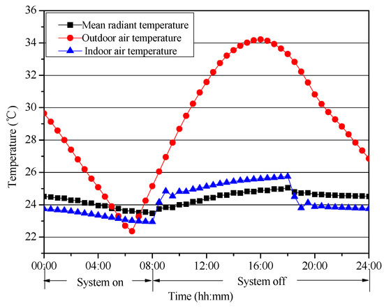 As far as TESCS is concerned, the heat transfer between the human body and the indoor environment includes the convection between the human body and indoor air, and radiation between human body and building envelopes. The mean radiant temperature is usually used when considering the effect of the surface temperature of surrounding objects on the thermal radiation intensity emitted from the human body. In the radiant cooled environment, the mean radiant temperature is an important thermal environment parameter that affects the thermal comfort of the human body. The mean radiant temperature is defined as the uniform temperature of an imaginary enclosure in which the radiant heat transfer from the human body is equal to the radiant heat transfer in the actual non-uniform enclosure. Figure 6 shows the trends of the indoor air temperature and the mean radiant temperature during a typical day under the intermittent cooling condition of the TESCS. It can be seen that the indoor air temperature and mean radiant temperature during the cooling period gradually decrease with the increase of the cooling time. However, when the cooling system is off, both gradually increase due to the effect of people, equipment, lighting and other internal heat gains, as well as external factors such as solar radiation and outdoor air temperature. Then, they gradually decrease with the disappearance of internal heat gains and the decreases of outdoor temperature and solar radiation. It also can be seen that since 8 a.m. when the system stops cooling, although the outdoor air temperature increases significantly, the indoor air temperatures do not increase significantly, due to the release of the heat storage of the cooling slab. The mean value of the indoor air temperature during office hours is 25.3 °C with the maximum and minimum values of 25.7 °C and 22.9 °C, respectively. The fluctuation of the indoor air temperature is little and the maximum change is 2.8 °C during office hours. The mean radiant temperature during office hours varies in a range of 23.8 to 25 °C, with a fluctuation range of 1.2 °C. It can be concluded that the indoor air temperature and mean radiant temperature can be basically kept stable under the intermittent control scheme.