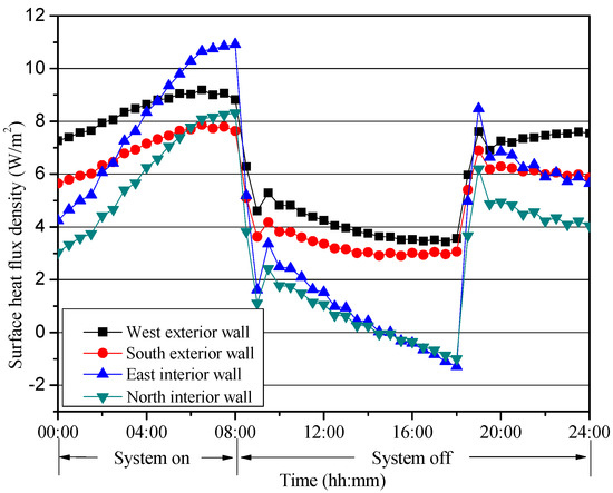 In the radiant cooled environment, two heat transfer mechanisms occur on the surface of the passive wall, including the radiant heat transfer between the passive wall and the radiant cooling surface and the convective heat transfer between the passive wall and indoor air. The presence of the radiant cooling surface makes the passive wall surface temperature lower than that of the conventional convective air conditioned room. When the surface temperature of the passive wall is lower than the indoor air temperature, the passive wall will release the cooling capacity. This section mainly analyzes the variation trends of the surface heat flux density of the passive wall to check whether there is a cooling capacity stored in the passive wall and obtain the effect of the passive wall on the indoor thermal environment. Figure 7 shows the heat flux density variation trends of the internal surface of the passive walls during a typical day. It can be seen from the figure that the internal surface heat flux densities of the south and west exterior walls during office hours (8 a.m. to 6 p.m.) are both positive values, which means heat is transferred from the outside of room to the inside. However, that of the east and north interior walls are negative values sometimes, which means there are a cooling storage and release in these two walls. This is mainly because there are heat exchanges between the exterior wall and the inside as well as the outside of room. Nonetheless, the heat transfer, due to the effect of outdoor air and solar radiation, is greater, so the internal surface flux density of the exterior wall is a positive value. However for the interior wall, there is heat exchange only between the interior wall and the indoor environment. Because there is heat exchange between the interior wall and the cooling slab, and thus some heat is stored in interior wall, it begins to release a cooling capacity when the cooling surface temperature is lower than the indoor air temperature. However, relative to the cooling slab, the cooling capacity released by these two interior walls is very small, almost negligible.