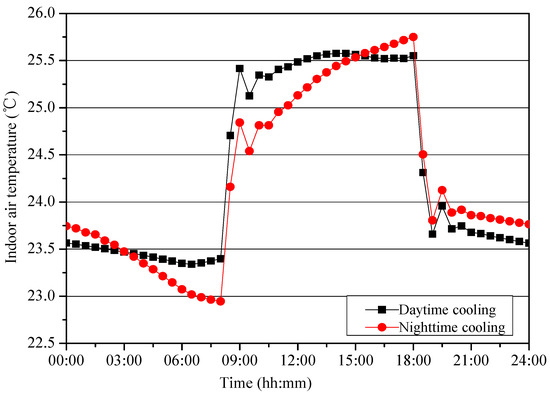 Indoor air temperature variation trends under daytime cooling and nighttime cooling during a typical day.