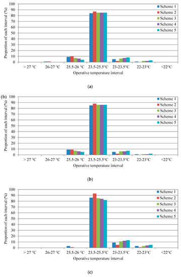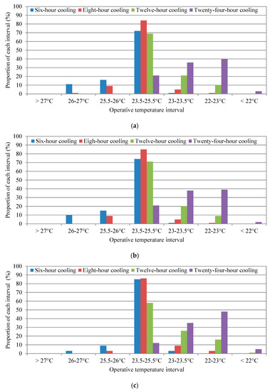 Proportions of time that different operative temperature intervals occur throughout the entire period of cooling under different distributions of time for cooling. (a) Top floor room; (b) second floor room; and (c) ground floor room.