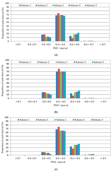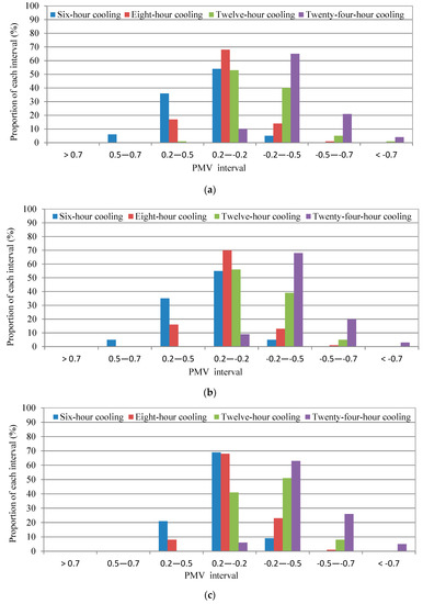 Proportions of time that different PMV intervals occur throughout the entire period of cooling under different distributions of time for cooling. (a) Top floor room; (b) second floor room; and (c) ground floor room.