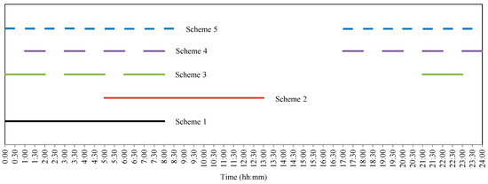 Section 3.2.1 compared the indoor thermal comfort and system energy consumption of radiant cooled room with continuous cooling under various durations for cooling. However, the varying distributions of cooling time throughout the same duration for cooling will also have an impact on indoor thermal conditions and energy consumption by the system. The primary focus of this section was the optimization of the distribution of cooling time. The concluded optimal cooling duration of 8 h derived from Section 3.2.1 was used as the total cooling duration. Nighttime cooling was mainly considered in Section 3.2.1. However, when it comes to cooling during the daytime, as a result of indoor and solar radiation heat gain on the cooling surface, some of the heat gain can be directly cancelled out by cooling water, and hence there is a relatively large cooling capacity of the radiant system [50,51]. Therefore, daytime cooling was also taken into consideration in discussions of this section. In this section, the primary intermittent operation schemes are: (1) Scheme 1: 8 h of continuous cooling from 12 to 8 a.m.; (2) Scheme 2: 8 h of continuous cooling from 5 a.m. to 1 p.m.; (3) Scheme 3: 2 h on, 1 h off; (4) Scheme 4: 1 h on and 1 h off; (5) Scheme 5: 30 min on and 30 min off. The detailed cooling time distributions of each scheme are shown in Figure 13. Cooling activities in Schemes 1, 3, 4, and 5 all take place at night-time, while there is a small part of the cooling activity in Scheme 2 that happens at nighttime, it is mostly daytime cooling.