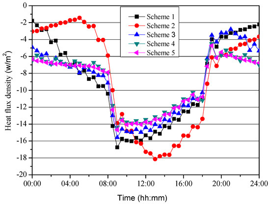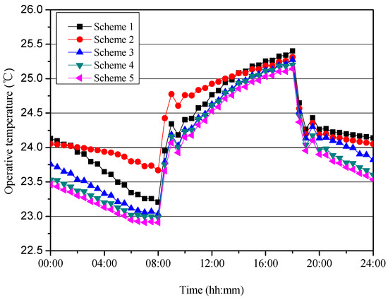 Figure 16 depicts the pattern of changes in the operative temperature of different cooling time distribution schemes on July 10. According to the figure, the temperature fluctuation of Scheme 2 throughout the office hours is the least amongst all, as a result of the particular condition of Scheme 2. More specifically, most of the running time coincides with office opening-hours, and there is a lower nighttime capacity for cooling and the reduction in the operative temperature is less marked. Throughout the part that overlapped with office opening-hours, the heat gains inside the room lead to an increase in both the difference in temperature between indoor air and the water tube and the capacity of the radiant slab for cooling, according to Figure 17. However, since most of the running time under Scheme 2 overlaps with office opening hours, low-cost electricity throughout the nighttime is not fully utilized under this scheme. Table 4 shows the total capacity for cooling supplied to all the three rooms through embedded tubes in the entire period for cooling with varying distributions of cooling time. According to Table 4, the biggest capacity for cooling is observed under Scheme 5, while the smallest is observed under Scheme 2. Figure 14 and Figure 15 show that the highest level of thermal comfort is achieved under Scheme 2. In conclusion, when ignoring night-time low-cost electricity and only considering energy savings and the improvement in thermal comfort, Scheme 2 is the optimal choice for this section.