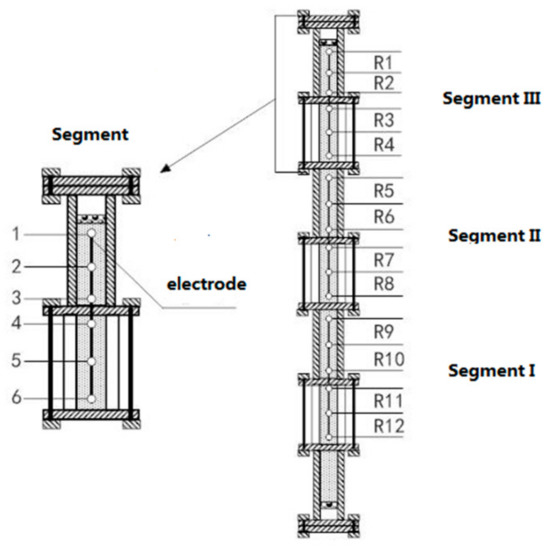 For the sensor system, four resistance temperature detectors (RTD, type PT100, T1, T2, T3, and T4) were inserted into stainless-steel tubes through a port set in the middle section of the external wall from the top to bottom of reactor (Figure 1). Two pressure transducers (Trafag 8251 model) were employed to measure pressure (P1, P2) inside the reactor at the bottom and top of the reactor, respectively. Temperature-measurement accuracy was ±0.1 K, and pressure-measurement accuracy was ±0.05 MPa. In addition, three rods containing 18 cyclic electrodes were inserted into the sand bed to detect the variation of electrical resistance of 12 depths denoted by R1–R12 in the sediments from the top down during hydrate formation (Figure 1 and Figure 2). Six electrodes were configured in one rod, making up four pairs of measuring circuit, as shown in Figure 2. The electrical resistance of sediments between electrodes was detected using a digital electrical bridge (DF-2819 model, Ningbo Zhongce Electronics, Ltd.). Resistance-measurement accuracy was 0.05%. The temperature, pressure, and electrical resistance were collected by a monitor and control generated system (MCGS) in real time. A digital camera was used to capture the morphology changes of hydrate crystals in pores through the sapphire tubes.