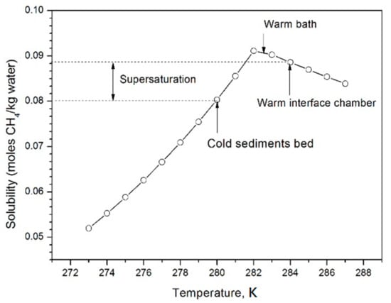 The following are the protocol steps of the hydrate-formation test. First, coarse sand was compactly packaged in the reactor and evacuated. Then, fresh brine containing no methane was pressurized into the sand bed in the formation reactor, and the sediment sample was prepared. Afterwards, the cooling room was cooled to the desired temperature. Meanwhile, brine in the three interface chambers was presaturated by CH4 gas under the desired pressure and temperature (7.4 MPa and 284 K). When temperature in the sand bed was stable, the whole system was connected, and the flow loop was started. The preinjected fresh brine was first displaced by the methane-containing brine, which could avoid the presence of free gas during injection. Then, the warm methane-containing brine was circulated through the cold sediments under a constant flow rate. Excess methane in the brine was converted to the hydrate phase. The supersaturation of methane could be calculated by Duan’s model [30], as shown in Figure 3. Brine from the top outlet of the reactor was saturated again by dripping through the free gas in the top part of the interface chambers. The flow loop was shut down when the differential pressure reached to 9 MPa, indicating sediment impermeability. A digital camera was used to record hydrate crystal growth in the porous media. Electrical-resistivity values at 12 depths in the reactor were used to characterize hydrate distribution inside the sediments. Resistivity values in the sediments were also used to monitor the presence of free gas during the initial injection process. The presence of free gas (possibly a bubble phase as insulator in pore space) during injection could have caused the sharp rise in resistivity and led to rapid clogging after hydrate formation (hydrate shell) in the inlet.