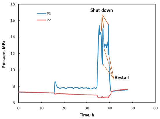 Figure 4 shows the pressure variation in the reactor during the circulation process. After the start of circulation, pressure in the reactor was stable in the first 15 h. However, at 15 h, inlet pressure P1 abruptly began to rise. This was thought to be an indication of hydrate formation that resulted in a decrease of sediment permeability. Afterwards, pressure in the reactor was stable again. Continuous hydrate formation could further reduce sediment permeability. Therefore, at 35 h, inlet pressure abruptly increased to 16 MPa; for safety reasons, circulation was stopped. When pressure P1 dropped to 8 MPa, circulation was restarted, and the inlet pressure of the reactor rapidly rose to 14.9 MPa again. Then, circulation was stopped again, and it was restarted at 37.5 h. Subsequently, inlet pressure slightly fluctuated around 13MPa. At 39 h, inlet pressure abruptly rose without a stopping trend; then, circulation was stopped, and the liquid was excluded from the reactor to decrease pressure. Pressure in the inlet (P1) was higher than that in the outlet (P2) from 16 to 39 h. Thus, at this time period, the theoretical solubility of methane in sediment brine was much higher than that in the interface chamber (pressure in the interface chamber was close to P2 in the outlet) [30]. However, the concentration (supersaturation) of methane in the flow loop was limited by the concentration of dissolved methane in the interface chamber with stable pressure. This indicated that methane-containing brine in the sediments was highly unsaturated under higher pressure, so no excess dissolved gas was liberated as a free gas phase during hydrate formation. This could also be verified by the resistivity curves.