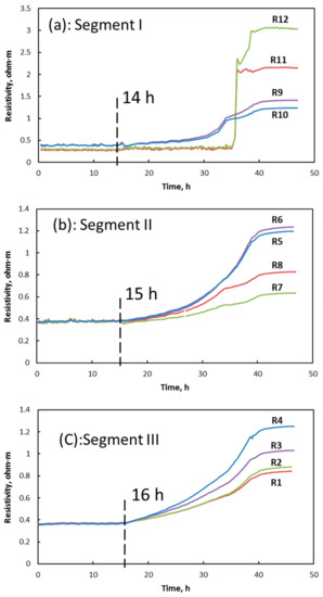 Electrical resistivity at all 12 depths experienced a three-stage evolution process. After the start of circulation, it stayed nearly stable. This could also verify the absence of free gas in the sediments during the initial stage of brine circulation. In the second stage, as presented in Figure 5, from down to up, a slow increase in electrical resistivity successively occurred in three segments at 14, 15, and 16 h, which indicated a bottom–up direction of hydrate growth that was consistent with the direction of brine flow. Specially, electrical resistivity R11 and R12 in the vicinity of the inlet of saturated brine had not revealed an obviously rapid growth trend until 35 h when a sharp increase emerged. In the second stage, different to hydrate formation from free gas [13], no obvious fluctuation in resistivity at different depths was observed. Smooth resistivity curves were also thought as an indication of the absence of free gas during hydrate formation in this flow loop. In the third stage, resistivity values in the whole reactor tended to be stable. Resistivity changes indicated ongoing slow hydrate formation and accumulation process in the sediments. The captured hydrate morphologies through the sapphire tubes also verified the hydrate-formation process.