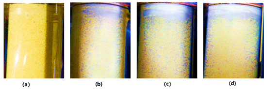 Figure 6 displays the hydrate morphologies captured in the sapphire tube in Segment I corresponding to R11 and R12. After the start of circulation, the warm fluid entered the hydrate-formation zone, and hydrates gradually nucleated in the sediments. As shown in Figure 6a, at the initial stage, thin hydrate film gradually emerged on the inner walls of the sapphire tube. Small-size hydrate particles did not contribute to the sediment’s electrical-resistivity increase. Afterwards, with rapid in situ hydrate growth occurring, large hydrate particles gradually occupied the pores, and part of the upward-migrating small particles accumulated in the throat pores. Figure 6b shows that the formed hydrates presented as a turbid colloidal solution accumulated at the top part of the sapphire tube. These caused a slight decline in the conductivity of the pathways and an increase in electrical-resistivity sediments. With hydrate growth, Figure 6c shows that the colloidal solution became massive white solid hydrates filling up the pore space, resulting in serious clogging in the flow pathways, leading to electrical resistivity rapidly increasing to a peak value. After circulation was stopped, as shown in Figure 6d, part of the dispersed hydrates vanished in the pores due to a recrystallization effect.