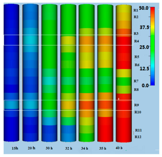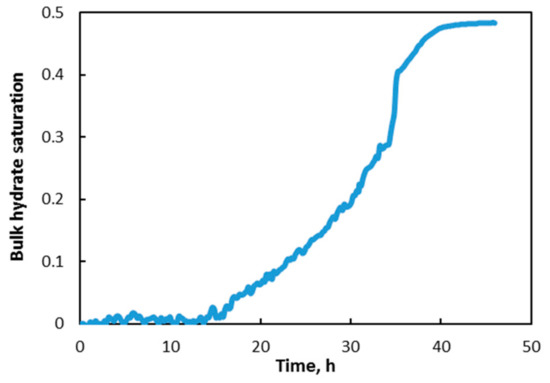 Figure 7 shows the inversed bulk hydrate saturation in the sediment bed. Hydrate saturation in the whole bed was basically zero in the first 14 h, which was the induction time of hydrate nucleation. In the range of 14–40 h, hydrate saturation gradually increased to about 47%. When circulation stopped, hydrate growth stopped, and hydrate saturation basically remained unchanged due to an insufficient gas supply. In free gas mode, the interaction between gas and water in the sediment was limited by the formed hydrates, resulting in low hydrate formation [31,32]. In this study, hydrate growth was limited by the difficult availability of dissolved gas rather than the transfer of methane between water and hydrate phases. However, when rapid hydrate preparation was demanded, it could be realized by adjusting the interface of gas and water in the interface chamber using enhanced technologies, such as a nozzle, to create microdrops when brine entered the interface chamber [19].