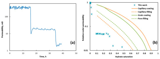 Permeability evolution of the sediments is displayed in Figure 9a, which shows that permeability initially remained stable or was slightly decreased. Then, a sharp drop emerged at 16 h with total hydrate saturation of less than 10%. Finally, the curve tended to be stable again. From resistivity and morphology analysis, at the initial stage, the formed thin hydrate film or fine hydrate crystals had weak influence on sediment conductivity. Because of rapid hydrate growth and accumulation in the pores, hydrate particles converted to massive solid hydrates, causing a sharp decline in sediment permeability. Relative water permeability under different saturations in this study is shown in Figure 9b, which was compared with the predicted values of four models (capillary coating, capillary filling, grain coating, and pore filling) [29]. Experiment values were much less than those in the model prediction. The assumption of the four models is that hydrates were homogeneously distributed in the sediments, and hydrate saturation and pore habit controlled sediment permeability. Current experiment studies on hydrate formation and dissociation were always conducted in a static system (in situ synthesis of hydrate-bearing sediments in laboratory), which could easily obtain homogeneous hydrates. However, in this work, the formed hydrates were heterogeneously distributed in the sediments and preferentially accumulated in certain depths; thus, the exponential decline of sediment permeability was induced even at very low bulk hydrate saturation (10%). Similar unusual permeability characteristics of samples with heterogeneous hydrates were also observed by Okwananke et al. [33]. They found that hydrates preferentially occupied the large pores of silica sand core samples, which caused rapid reduction in sample permeability with an increase in hydrate saturation. Interestingly, they also found that higher saturation of methane hydrates could lead to relatively higher gas permeability for unconsolidated sand-clay core samples due to hydrate-forced heave phenomenon. These results indicated that studies on permeability of hydrate-bearing sediment should consider hydrate heterogeneity in sediments, as well as channel structures and hydrate pore habits.