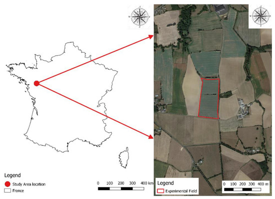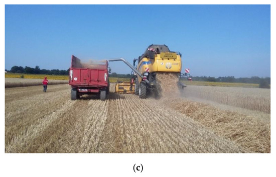 Both two-years tests were carried out on the same field in Le Flaux (Pannecè, France) (47°29’16.4”N 1°13’26.1”W) (Figure 1). The sowing of wheat took place in the 43rd week in both years at a density of 225 kg ha−1, a 50% blend of the two cultivars was used—Absalon and Syllon. In both years, the same regime of fertilization and pest control was followed. The harvest in 2018 was performed during the 29th week, while in 2019 it was performed in the 30th week. During the week before the harvest, a homogeneous area of about 6 ha was selected and delimited to perform the tests.
