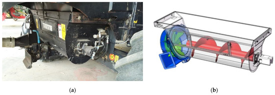 The Thievin system for the chaff recovery, named “Turbopaille” [23], was mounted in the rear part of the combine harvester. It had a dedicated tank provided with an endless screw, which pushed the chaff in the inlet of a turbine. Here, the turbine increased the pressure of the air and the chaff was forced out through a pipe (Figure 2).