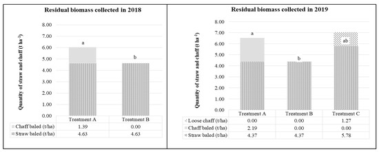 Biomass collected (in FM) per treatments during the tests carried out in 2018 and 2019. Treatment A—straw and chaff baling; treatment B—only straw baling (chaff spreading on the ground); and treatment C—straw baling and separate chaff collection on trailer. By including the chaff in the bales, 1.39 t FM ha-1 and 2.19 t FM ha-1 could be collected in 2018 and 2019, respectively. On the other hand, only 1.27 t ha-1 of loose chaff could be collected in the 2019 test. Different letters in the graph denote the presence of significant differences (p < 0.05) in the quantity of straw and chaff collected among treatments.