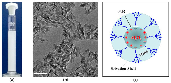 Dispersion stability of Al2O3-H2O nanofluids and its microcosmic mechanism: (a) Nanofluids standing for 4 h; (b) Scanning electron microscopy images of γ-Al2O3 nanoparticles; (c) Stable structure of the electron double layer.