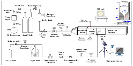 As shown in Figure 3, the experimental system mainly comprised three parts: a liquid spray unit, an airflow control unit, and a shadow imaging unit. The spray unit provided continuous liquid injection through a multifunctional pressure tank (5 L/1 MPa). The flow rate of the nanofluids was adjusted by a needle valve and measured using an electromagnetic flowmeter (RONK DN4, Chongqing Sichuan Instrument Co., Ltd., Chongqing, China). A high-precision pressure sensor was used to monitor the injection pressure. To inhibit extra interferences from cavitation and turbulence, a conical nozzle with a length/diameter ratio of 4 was used as described by Wu et al. [1] (Figure 3). With reference to the conclusion of Faeth et al. [40], a sufficiently long straight pipe section (length-to-diameter ratio of 40) was arranged upstream of the nozzle inlet. Therefore, the flow in the tube was fully developed, and the liquid at the nozzle inlet was uniform in all directions.