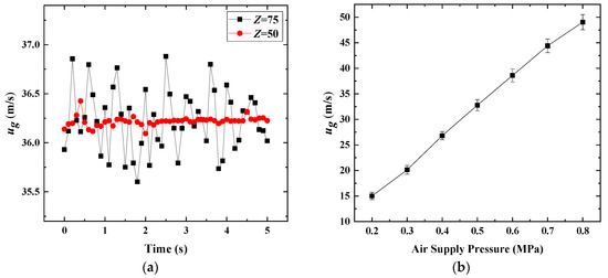 The airflow control unit uses a large-capacity gas tank (2000 L/4 MPa) for air supply. After filtration and drying using a cold dryer, the tank was filled with air by an uprated compressor. The airflow was precisely controlled using a decompressor group, buffer tank, and throttle valves. A multi-hole balance flowmeter (RONK DN65) was used to monitor the airflow rate, and a hot-wire anemometer (MODEL 8465, TSI Incorporated, Minnesota, USA) was installed in the test section for calibration. To obtain a uniform air crossflow, three rectifying nets were arranged at different connections of the variable cross-section upstream. The cross section of the test zone was rectangular, with a size of 100 × 75 mm2, and there was a transparent window made of quartz glass with a size of 100 × 200 mm2. A high-speed data collector was used to obtain the real-time flow status, including the pressure, temperature, flow rate of the airflow and liquid jetflow. To verify the stability of the air crossflow, a TSI 8465 sensor was used to measure the air velocities at two different positions under an air supply pressure of 0.6 MPa. One position was the center of the air-duct cross section, directly above the nozzle exit (Z = 50), and the other was 75 mm above the nozzle exit (Z = 75).