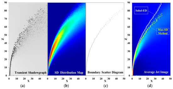 The jet boundaries obtained via the Max-SD and Sober-ED methods were plotted on the average jet shadowgraph (Figure 5c). The boundary curve obtained via the Max-SD method exhibited closer agreement with our expectations and the parabolic characteristics. Compared with the Sobel-ED method, the Max-SD method is usually more efficient. This new method does not require an additional process to filter out the interference due to the background and noise and is not affected by threshold selection.