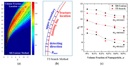On the SD contour map, the liquid column is the main body in the area surrounded by the upwind and downwind boundary lines, which corresponds to a series of maximum SD values on the upper and lower sides, respectively. In the outer zone of the boundaries, the broken liquid ligaments or droplets are the main body. The contour line closest to the downwind boundary line connects the surface breakup zone on the right to the liquid-column fracture zone on the top. After the SD contour map is uniformly transformed into a 0–255 grayscale image, this contour line can be used to indicate the starting position of the liquid-column fracture. In this study, the nearest contour line outside the downwind boundary was tracked. The detection point was moved up to the intersection area of the upper and lower boundaries to determine the column fracture location, as shown in Figure 6a. In identifying the fracture position via the SD-contour method, the distance between the two adjacent contour lines affects the location precision. Thus, to reduce the deviation, the contour lines were drawn with a sufficient density, and the number of lines was kept constant (30 lines) in the processing.