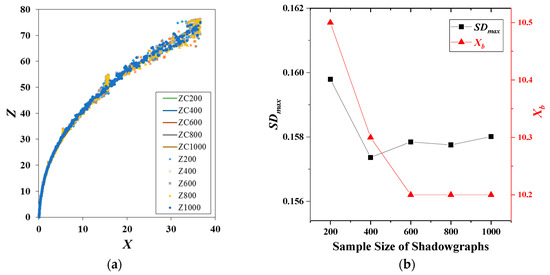 Third, to verify the convergence of the Max-SD and SD-Contour methods, the effects of the sample size of the shadowgraphs on the processing results were examined, as shown in Figure 7. 200–1000 samples were selected for image processing, and the results for the upwind jet boundary were essentially the same between the two methods when the number of images reached 200. The column fracture position Xb converged when the number of samples reached 600, which was consistent with the trend of the maximum SD. Therefore, in this study, 1000 shadowgraphs with 1-ms intervals were selected to ensure good convergence.