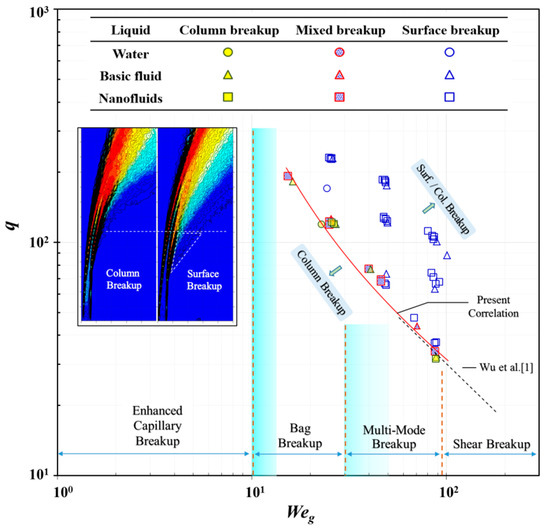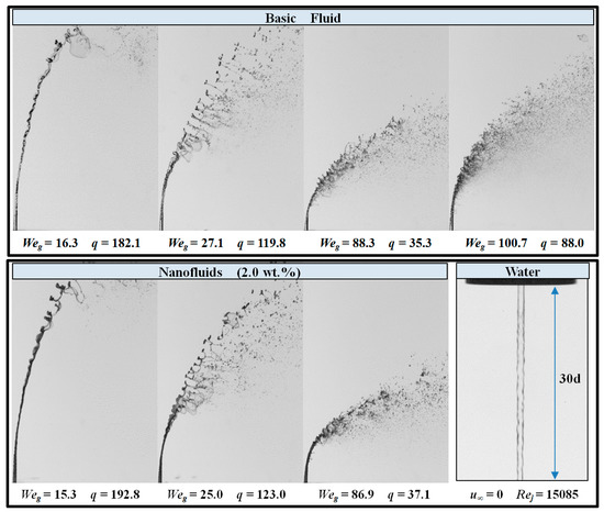 To investigate the differences in the primary breakup regime due to the nanoparticles, a Weg–q regime map was drawn for all the liquids, as shown in Figure 9. The results were consistent with those reported by Wu et al. [1]. In the map, the critical Weg of water, basic fluid, and nanofluid overlapped, indicating that the nanoparticles had no effect on the transition of breakup modes.