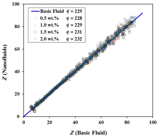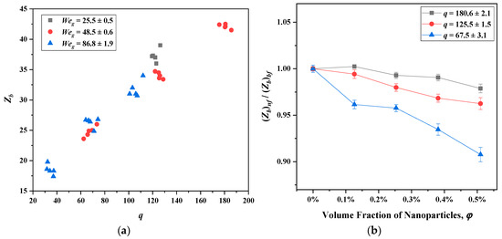 The results indicate that Xb increased with a decrease in Weg but had almost no correlation with q (Figure 13a). Zb increased with q but had almost no correlation with Weg (Figure 14a). The fracture distance of the liquid column decreased as the nanoparticle concentration increased. Relative to the basic fluid, the fracture location Xb of nanofluids descended more rapidly at a larger Weg number, and the location Zb descended more rapidly at a smaller q number. This is consistent with the conclusions of Kannaiyan et al. [33] and Li et al. [35]. When the mass concentration of nano-alumina was 2.0 wt.% (corresponding volume fraction was 0.51%), the fracture distance Xb in the present test was shortened by approximately 20% (Weg = 92, Rej = 19074) compared with that of the basic fluid, and the breakup length was reduced by approximately 17% (Rep = 27450) reported by Kannaiyan et al. [33], which was on the same order of magnitude.