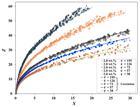 The correlation coefficient of the fit was 0.98. This fitting result is approximate to the previously reported expression, i.e., , which is based on mechanical analysis. Both indices of q are 0.5, while the present index of X is slightly smaller owing to a stronger drag force caused by the column deformation. As shown in Figure 12, the fitting curves are consistent with the experimental data of the jet trajectory over a wide q range.
