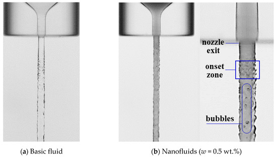 As shown in Figure 15, in the absence of visible bubbles upstream the nozzle exit, no bubbles were observed inside the basic fluid jet. However, for nanofluids with a concentration of 0.5 wt.%, a stream of bubbles with sizes of 0.2–0.4 mm appeared in the jet core region. The bubbles emerged from the jet inner zone with enhanced disturbance near the nozzle (blue rectangle in Figure 15b). Thus, the addition of nanoparticles increased the amount of nucleation sites and promoted cavitation in the jet. Additionally, the generation of bubbles caused interface breakup inside the jet, accelerating the fracture of the liquid column.