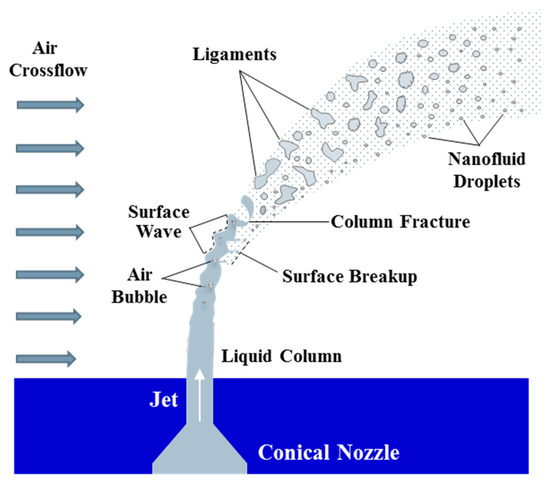 The primary breakup of nanofluid jets in a crossflow at a small Weg is depicted in Figure 17. After being ejected from the nozzle, the liquid column is deflected and compressed by the crossflow. Two types of breakups occur, accompanied by an increase in instability: (i) the formation of a column wave when the threshold of the amplitude of the surface wave is reached, which causes the liquid column to fracture, and (ii) cavitation caused by disturbance in the nanofluid jet, which is followed by internal interface breakup. In some cases of a high Weg or q, the surface breakup occurs in the form of boundary-layer stripping, similar to Rayleigh breakup, which results in smaller droplets.