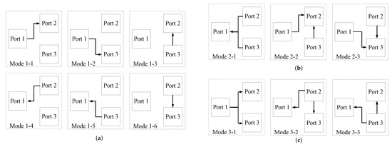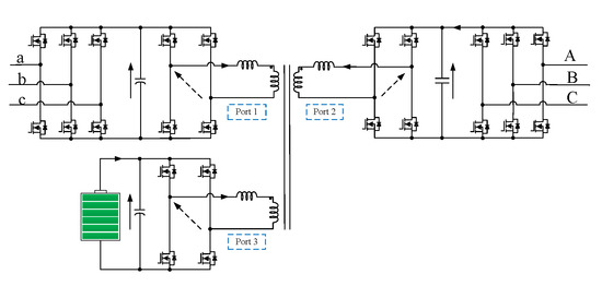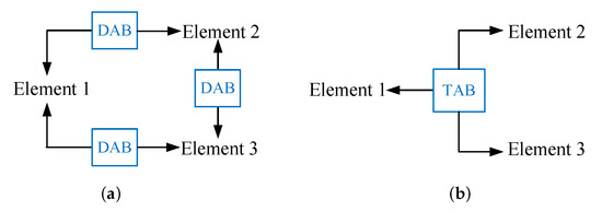 Therefore, the triple-active-bridge (TAB) converter was proposed to connect one more element by adding one more port to the DAB converter, as shown in Figure 2 [17]. The advantages of the DAB converter can be kept in the TAB converter. Moreover, it is not only applicable to one more port but also enables flexible power transmission between three ports, as shown in Figure 3. This shows that three DAB converters are required in Figure 3 to achieve flexible power transmission between three elements, which is achieved by only one TAB converter in Figure 3b. Also, the communication between the three elements is not necessary when using the TAB converter. Therefore, the control of the total system is more straightforward. In addition, in comparison to other multiport converters, the TAB converter has the advantage by using a transformer, which not only converts the voltage ratio but also improves the safety of the system. Therefore, the TAB converter is proposed for many applications in IES and DC grid.