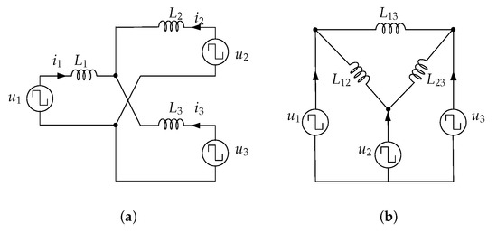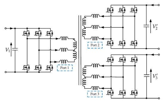Figure 5 shows Y-type and -type equivalent circuits of the TAB converter, respectively [40]. The voltages and currents of the port-2 and port-3 refer to the port-1 as the following equation.