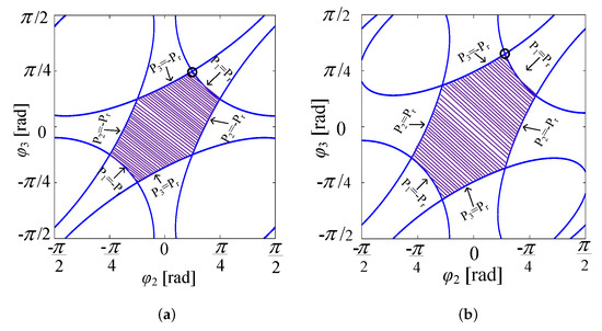 Figure 8 shows the phase shift operation of the TAB converter in all operation modes by using two phase-shift angles. The horizontal and vertical axes show the phase shift values of port 2 and port 3, and , respectively. The phase shift angles are decided by the operating power, inductance values, and voltages as the relationship in (2)–(4). The series inductances are important elements of the TAB converter. A normalized design method for the inductances was discussed in [21,22]. Voltage variations, which are in many applications, need to be considered in operation modes. Figure 8a shows the phase shift operation when the voltages of the three ports are all 100%. Figure 8b shows the phase shift operation when and are both 100%, whereas is 80%. It shows that the SISO modes are the most critical in the design and control of the TAB converter, where the phase-shift angles are the largest.