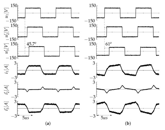 The experimental waveform of each port in operation mode 1-2 is shown in Figure 9 to explain the characteristic in one of the most critical operation modes. The figure shows that the root mean square (RMS) and peak current of port 2, , are much higher in the voltage variation condition. In this case, the combined duty cycle and phase shift control can be applied to reduce the RMS and peak currents of port 2 [38,39,40,42].