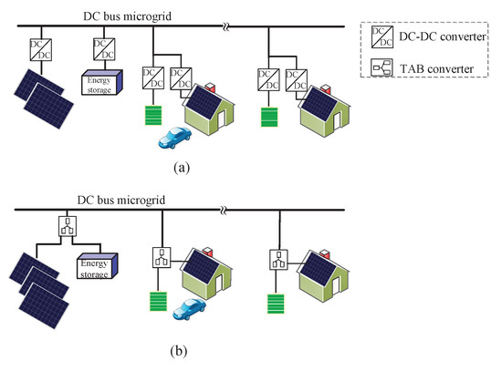 Comparison of DC bus microgrid using the TAB converter and the conventional DC-DC converter. (a) The system uses the conventional DC-DC converter. (b) The system uses the TAB converter.