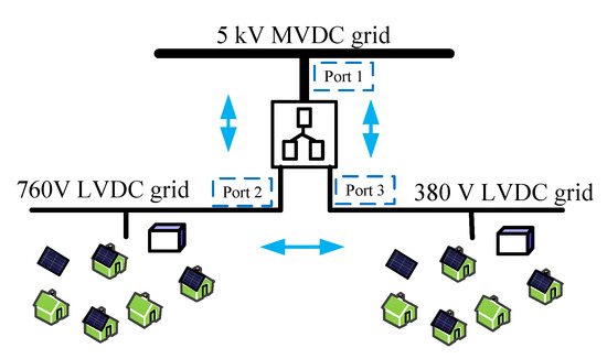 The medium voltage DC (MVDC) grid has recently created a need for the investigation of the concept of the DC distribution grid [43,44,45]. The overall stability and efficiency of the DC grid are increased by controlling the power flow [26]. Therefore, a three-phase TAB converter is proposed for the MVDC grid in [26,27,28,29,30], as shown in Figure 12. The nominal voltage of the MVDC grid is 5 kV. Two LVDC grids work at 380 V and 760 V, respectively. The 760 V LVDC grid is examined as a ±380 V LVDC grid. The TAB converter can use all operation modes in Figure 7 for this application because the power is required to be transferred in any direction among the three ports. It can operate as an equal three DAB converter as shown in the comparison in Figure 3. Therefore, the system can reduce the number of components and costs by using the TAB converter. In typical operation, the power mainly comes from MVDC to LVDC as the operation modes 1-1, 1-2, and 3-1. However, in some critical situations, the remaining operation modes of the TAB converter can be used for this application. Then, three grids can support each other. This shows that the TAB converter can be optimally utilized for all operation modes in this application.