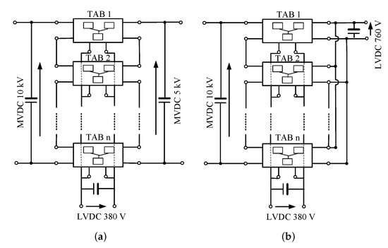 Other configurations, which can connect multiple single-phase TAB converters, can also be applied to interconnect MVDC and LVDC, as shown in Figure 13 [46,47,48]. It can connect two ports in series and one port in parallel to connect two MVDC grids and one LVDC grid, as shown in Figure 13a. Figure 13b shows the system which connects one port in series and two ports in parallel to connect one MVDC grid and two LVDC grids. The number of modules is selected depending on the available semiconductor devices and operating voltage. The insulated-gate bipolar transistor (IGBT) devices rated 4.5 kV are considered for high voltage applications. More research to utilize the devices and voltage range of each module should be discussed more in the future.