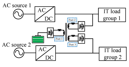 The reliability of the distribution systems for data centers is of the most importance points. Interruptions of power systems in the data center have the high cost of millions of dollars an hour [51]. Therefore, the TAB converter was proposed to improve the reliability and availability of power distribution of data centers in [34,35], as shown in Figure 16. This system can operate as a UPS system to prevent power faults in distribution systems of the data center. The number of converters can be reduced by sharing a battery between two distribution lines. Consequently, using the TAB converter can reduce the cost of the system. Furthermore, two distribution lines can support each other in a critical situation. Therefore, all operation modes of the TAB converter can be used in this application, which maximizes the advantages of the TAB converter.