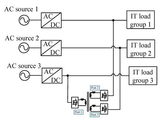 Typically, the data center distribution system has many independent loads. The power requirement at a time is different for each load. Some loads may require high power while others need low power. Balancing the load can improve the sustainability of the system. In order to improve the reliability of the data center distribution system, the TAB converter was proposed to share the power between the distribution lines in [52], as shown in Figure 17. The power distribution in each load group is evaluated. The TAB converter balances the power load for the data center system. This can improve the reliability of the system from 96.00% to 97.53%. Therefore, the TAB converter is a promising candidate in this application. However, the stability and accuracy will be the challenge for controlling the TAB converter in this application because of high-reliability requirements.