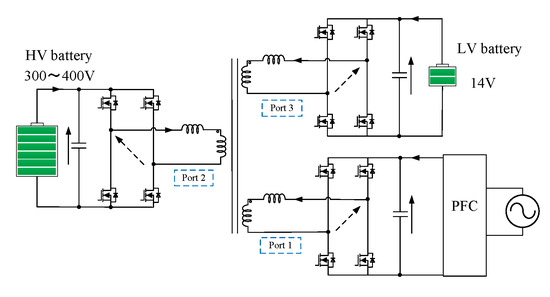 - Kim, S.Y.; Jeong, I.; Nam, K.; Song, H.S. Three-Port Full Bridge Converter Application as a Combined Charger for PHEVs. In Proceedings of the 2009 IEEE Vehicle Power and Propulsion Conference, Dearborn, MI, USA, 7–10 September 2009; pp. 461–465. [Google Scholar]