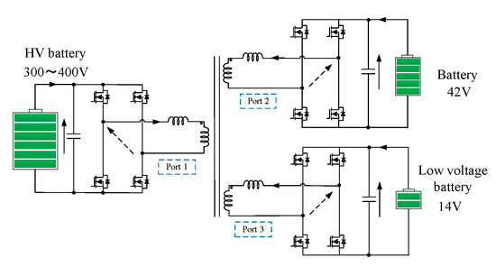 The 42 V bus for EVs was discussed in [40] to increase the power for HEVs. Therefore, the electrical system may have three voltage levels (14 V/42 V/400 V). The TAB converter has many advantages for this system because it separates voltage levels using one converter with a three-winding transformers, as shown in Figure 19. The power can be supplied from three storage systems effectively during start-up or regular running. This shows that all the operation modes of the TAB converter can be applied in this application to maximize the power and lifetime of the system. In the future, the studies on optimal power and operation modes for each condition of the system can be discussed more.