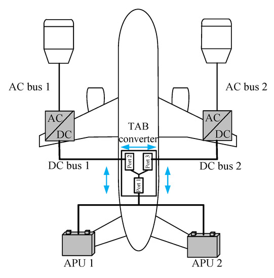 Beside electric vehicles, the more electric aircraft (MEA) has been widely researched and discussed to reduce emissions in the world [54,55]. The electrical system in MEA requires improved efficiency, reliability, and reduced implementation costs. The electrical system usually uses a 230 V AC voltage and two DC voltages, of 270 V and 28 V, respectively. The auxiliary power unit (APU) is used to supply power when the MEA is on the ground. It can use a battery and fuel cell system of 270 V or 540 V [55,56,57]. The battery can also be used for emergency situations, to store energy in low load conditions, and support in heavy load conditions. Therefore, the TAB is proposed to regulate power flow in MEAs in [58], as shown in Figure 20. Two DC voltages and APU are connected and supported by one TAB converter and a centralized control system.