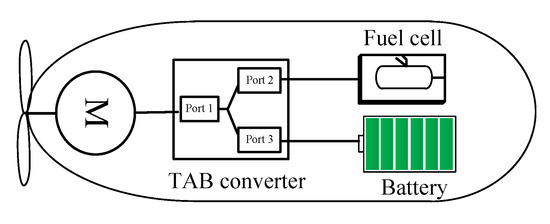 The autonomous underwater vehicles (AUVs) have spread widely in recent years [63,64,65]. The size and weight of the AUVs are limited, and the data can be corrected if the AUVs can work for a long time. Therefore, the power system of the AUVs is a challenge. The Lithium-ion battery is used for AUVs because of its high power density [63]. The fuel cell system for AUVs is discussed to extend their working time [64]. The integrated fuel cell and battery systems for AUVs have been discussed in recent times [65]. This can achieve a higher power density, which reduces the number of the batteries and increases the power for the AUVs. With the many advantages in the integrated power system, the TAB converter is a promising candidate for this application. A TAB converter can be connected directly between the motor driver (M), fuel cell, and battery, as shown in Figure 21.