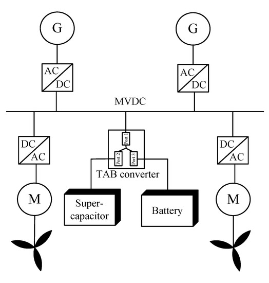 All-electric ships (AESs) are developed to improve the efficiency of energy in the ships [66,67]. The advantages of MVDC distribution for all-electric ships (AESs) was discussed in [68]. By using MVDC (1–8 kV) distribution, the motor is not connected to a fixed-frequency system and can be designed and operated to maximize efficiency. The advantage of the battery energy storage system (BESS) for the ship was discussed in [69]. Therefore, the electrical ship is a promising application of the TAB converter in the future, as shown in Figure 22.