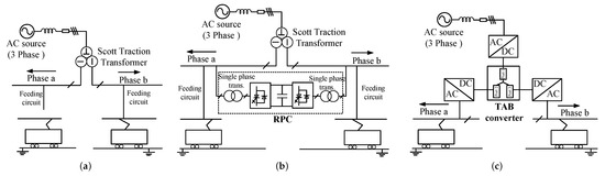 Proposed future concept for shinkansen power supply using the TAB converter: (a) conventional railway power utility system, (b) railway static power conditioner to balance voltage, (c) future concept using TAB converter.