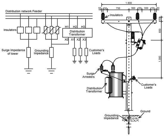 Usually, the main equipment that made up the distribution network poles presented in the pole types P1, P2, and P3 were: distribution transformer, surge arresters, insulators, grounding mesh, loads, cables, and others, all of which could be represented through their electrical models for computational simulations of electromagnetic transients involving lightning discharges.