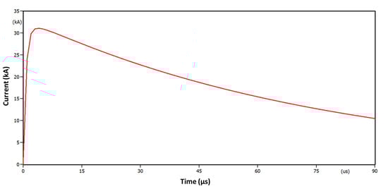 Heidler’s current impulse with parameters 3.83/77.5 s and 31.1 kA.